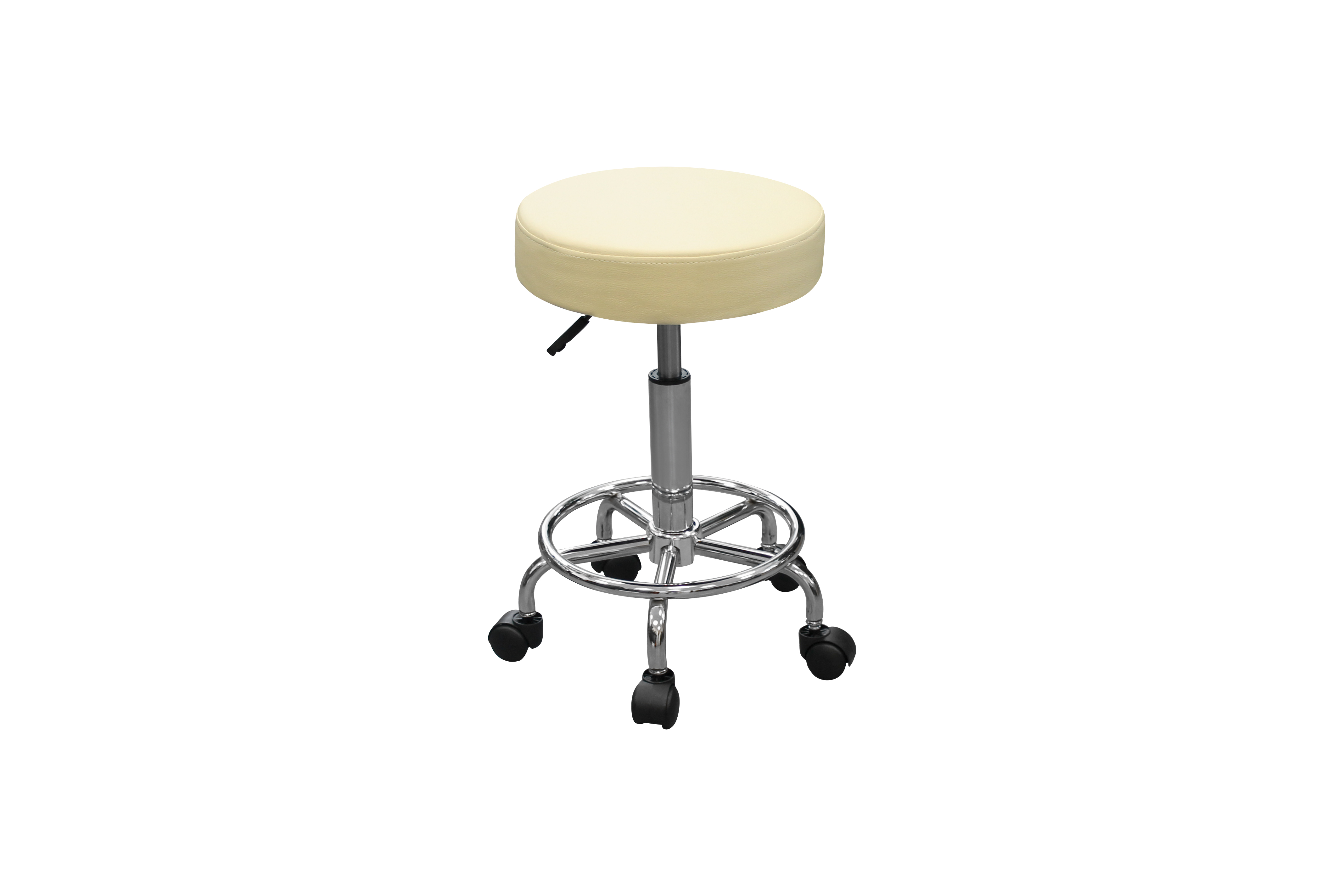 Табурет лабораторный с мягким сиденьем, с кольцом-опорой для ног, на колесных опорах.