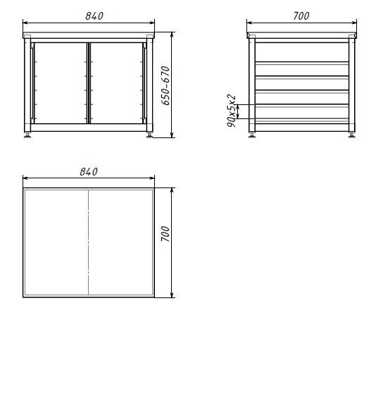 Каркас — труба 40х40 мм из нержавеющей стали, выполняется разборным. Оснащаютсвинтовыми опорами, позволяющими регулировать высоту в пределах 20 мм. Рассчитан на совокупную нагрузкдо 100 кг