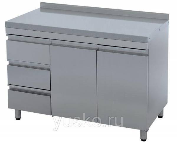 Стол-тумба (с ящиками) может выполнять функции обычного рабочего стола, а также использоваться для хранения посуды, инвентаря, сухих продуктов, моющих средств.
