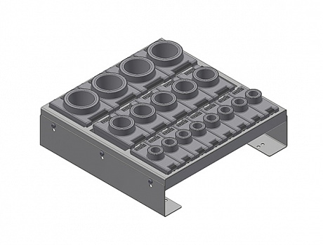 Рама представляет собой несколько секций для держателей инструмента и полностью заполняет по ширине и глубине ящик тумбы соответствующего типоразмера. Предназначена для бережного хранения и перемещения оснастки и оправки.