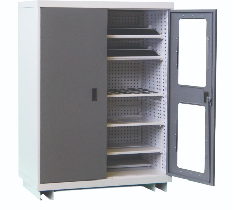 Шкаф для комплектующих, тяжелого инструмента и машиностроительной оснастки. Комплектуется 2 дверьми (1 глухая и 1 с окном из поликарбоната), замком и внутренней перфорированной стенкой.