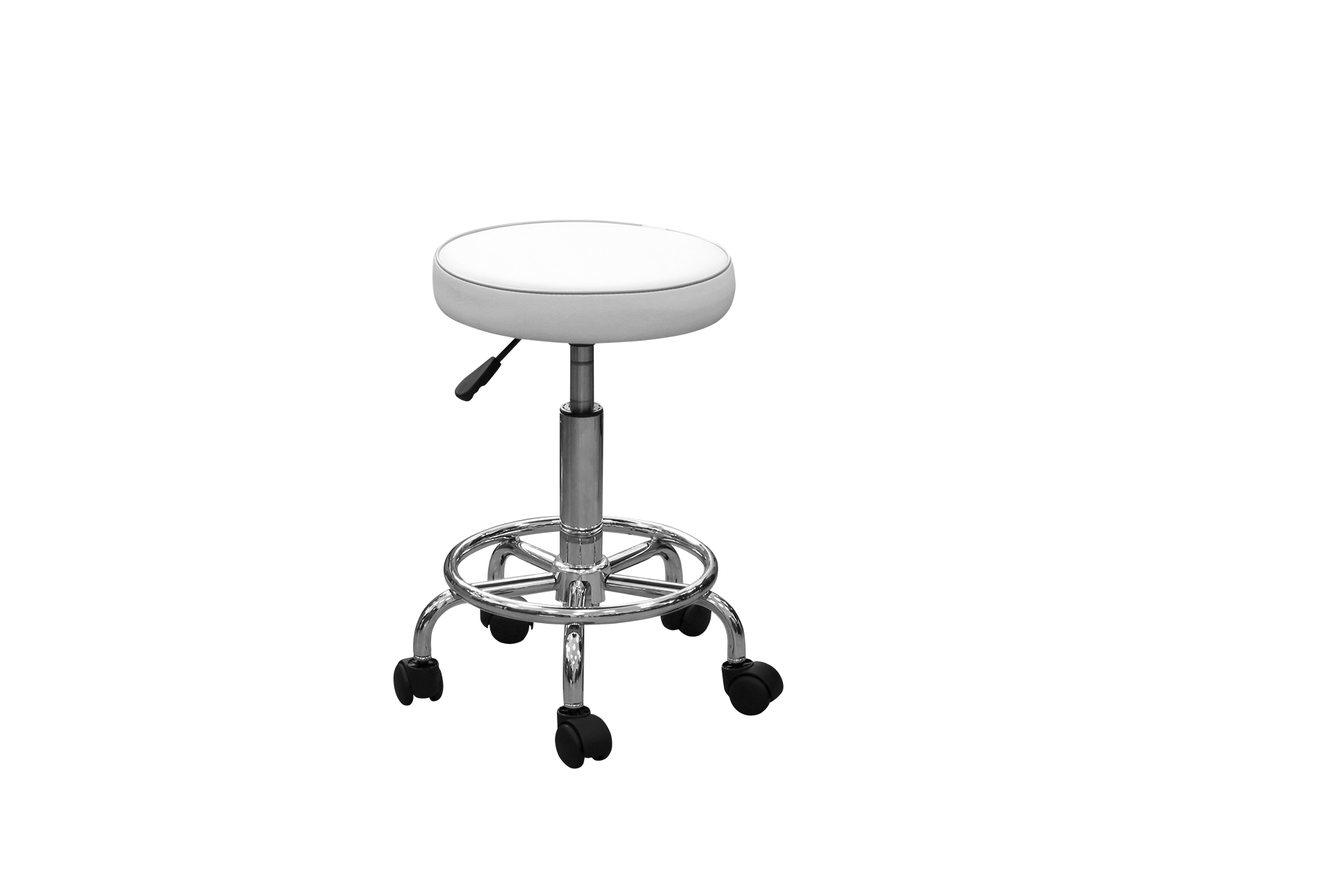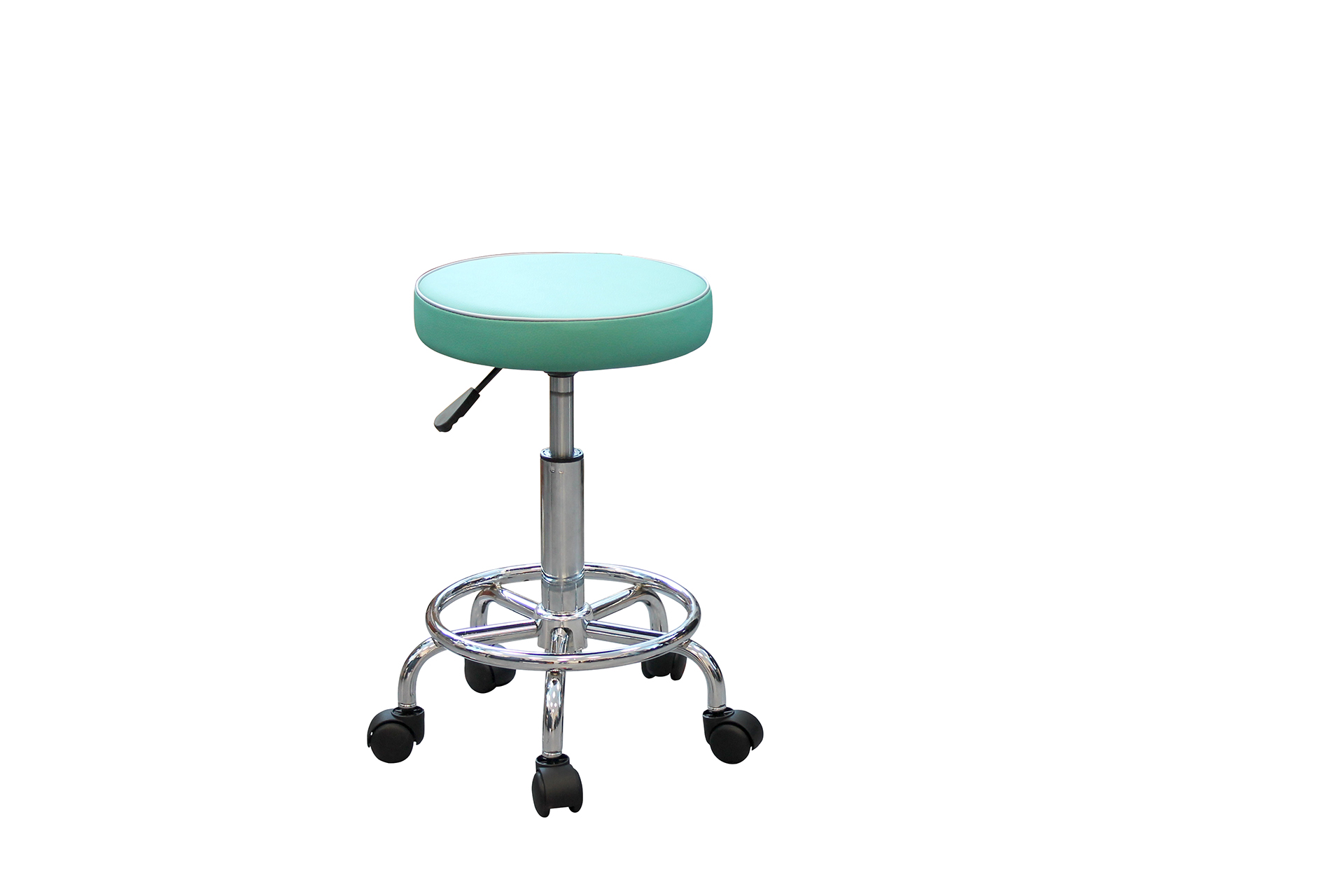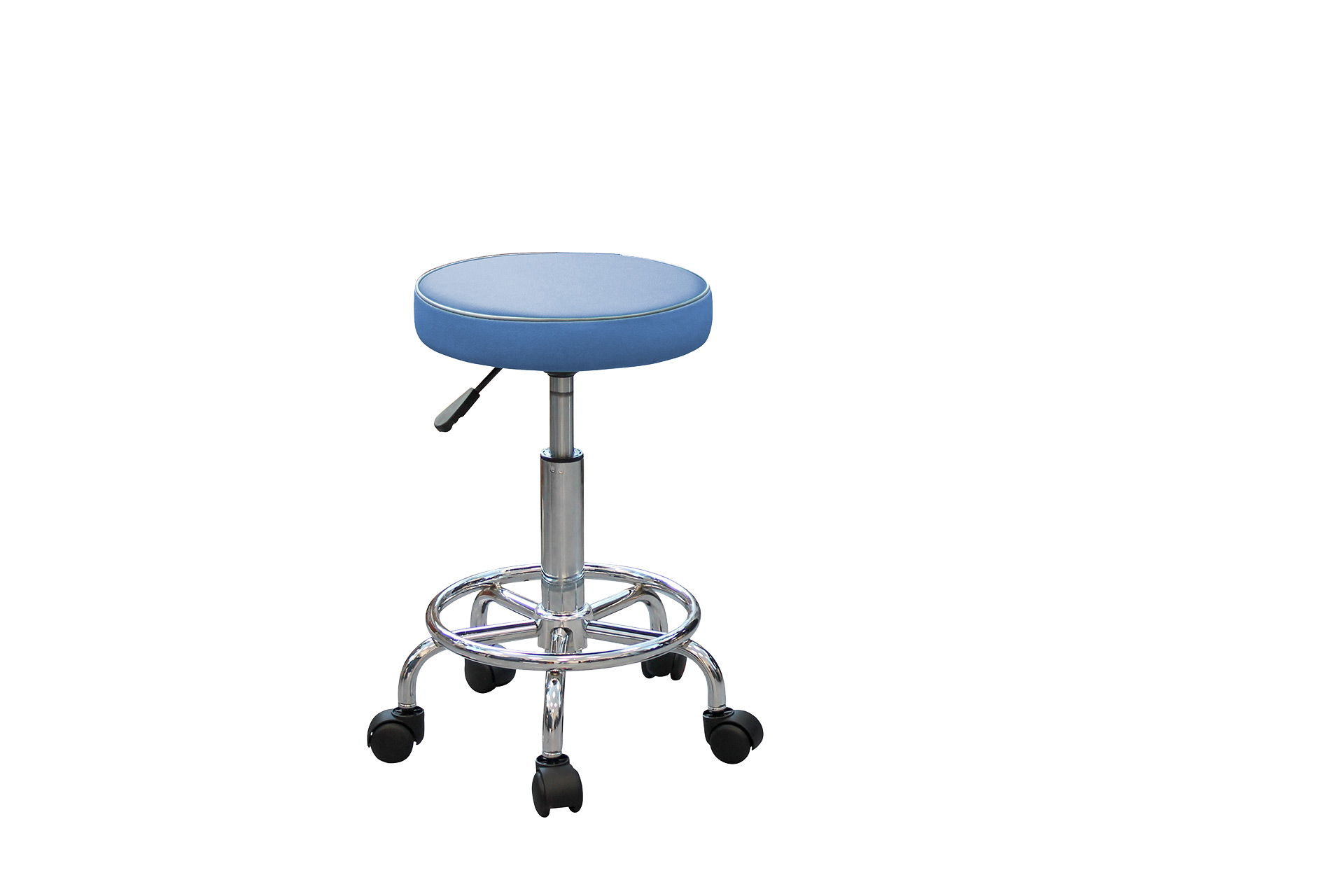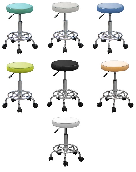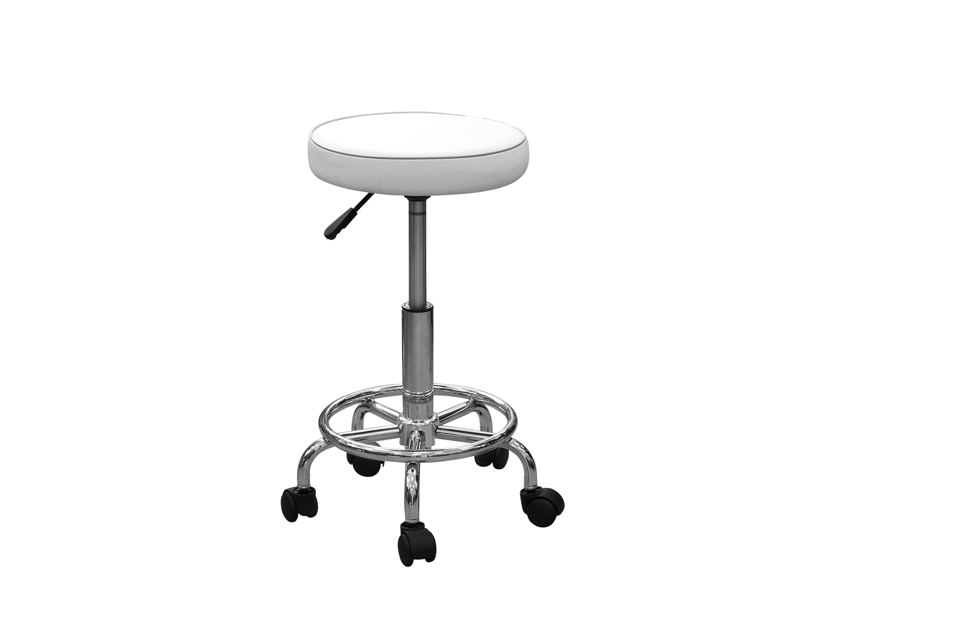 Лабораторный табурет с мягким сиденьем, с кольцом-опорой для ног, на колесных опорах.