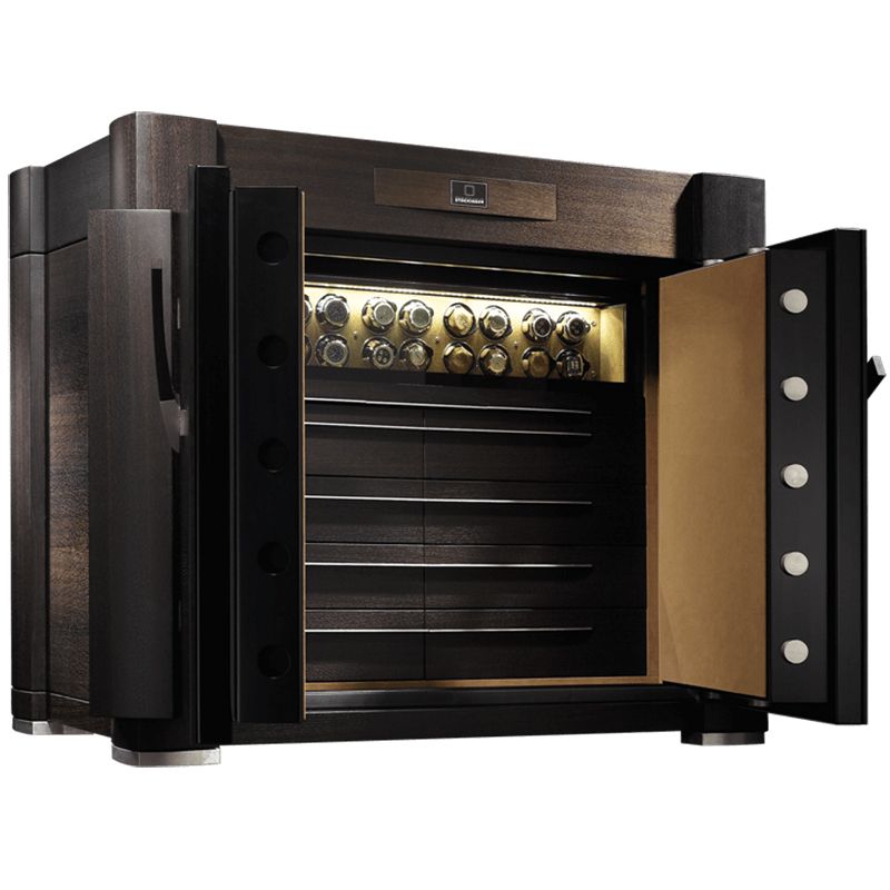 В разработанном специально для удовлетворения потребностей коллекционеров часов сейфе Hyas с 8 вместительными выдвижными ящиками и 18 или более устройствами для подзавода часов имеется достаточно места для надежного хранения Вашей коллекции в красивом антураже. При этом двустворчатая дверца имеет многослойную конструкцию и блокируется посредством специальной системы безопасности со всех 8 сторон.