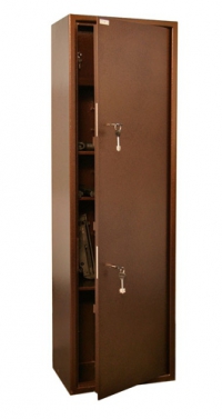 Оружейный сейф на 3 ружья. Отделение под патроны, запираемое на замок. Съемные полки позволяют разместить дополнителную амуницию или в дальнейшем увеличить количество размещаемых стволов. Шкаф оборудован пластиковыми ложементами на 3 ружья. Ложементы обеспечивают надежное хранение оружия и позволяют сберечь оружие от царапин и потертостей. Корпус сейфа выполнен из стали 1.5 мм, дверь - из стали 2 мм. Дверь коробчатая, усилена фальшпанелью и притоплена для обеспечения взломостойкости. На двери расположены элементы для шомполов и масленок. Два сувальдных замка "Просам" повышенной секретности. Покраска полимерная-медный антик. Сейфы удовлетворяют всем требованиям предъявляемым МВД к хранению оружия физическими лицами.