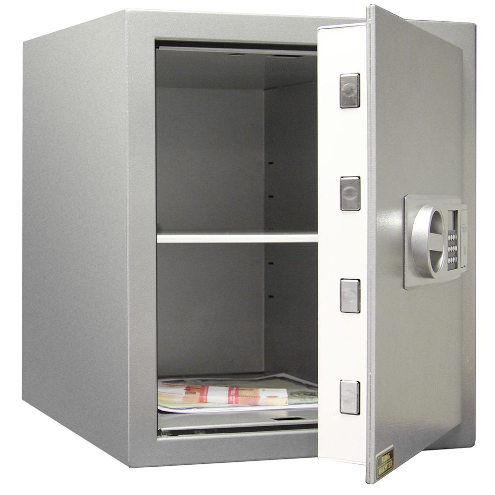 Немецкая компания Burg-WACHTER известна во всем мире. Высокая репутация гаранта надежности и безопасности по-настоящему заслужена. Сейф MTD 24 NE – это настоящий бриллиантовый «Карат» своей линейки. Трехсторонний замок с усиленными болтами, двухступенчатая система защиты от взломов надежно защищают от взломов. Уютное внутреннее пространство и регулируемая полка создают дополнительный комфорт. • Проведение типовых испытаний и контроль безопасности со стороныECB.S/VdS(органы сертификации систем безопасности) • Защита от пожара и взлома • Трехстеночный корпус, внешняя оболочка из специальной огнеупорной стали • Двустенная дверь с дополнительным армированием, дверная плита из SM-стали толщиной 7 мм • Защитное бронирование замка • Трехсторонняя фиксация посредством мощных четырехгранных ригелей; верхние и нижние ригели имеют встроенные стальные трубы для дополнительной защиты от газовой резки, сверления и пробивания • Сквозная подпирающая шина с петлевой стороны • Предусмотрено крепление к стене или полу, крепежный материал поставляется в комплекте – предельная надежность против вырывания. Боковое и нижнее отверстия расположены по центру • Огнеупорный материал по стандарту DIN 4102-A1, корпус с огнезащитным фальцем • Глубина рассчитана для хранения папок, в наличии одна Съемная полка • Цвет: платиновый серый • Дополнительная безопасность: Термическая система аварийной блокировки, специальная защита от пробивания, установленная перед каждым засовом и перед замком. SecuTronic – первый биометрический сейфовый замок с VdS-сертификацией, собственная разработка компании BURG-WACHTER. • Признанный VdS сейфовый замок с модулем сканирования отпечатков пальцев, класс 2 • Возможность запрограммировать до 20 отпечатков • Чтобы открыть сейф при помощи сканирования отпечатков пальцев, необходимо задать не менее двух дополнительных операций (это может быть сканирование другого отпечатка, ввод пин-кода или электронного ключа) • Сканнер оснащен специальной системой идентификации „Fake Finger Detection“ и способен распознавать поддельные пальцы • Точный и высокочувствительный способ аутентификации различных состояний кожи – от предельно сухой до влажной • Открытие сейфа при помощи сканирования отпечатков происходит быстро и комфортно SecuSafe – перенастраиваемый замок высокой надежности • Замок класса B согласно стандарту EN 1300 • 10 подпоров • 50 миллионов комбинаций • Возможна немедленная перенастройка на новый вариант закрытия при утере ключа • Немедленная реализация возможности открывать свои сейфы одним ключом (пример: клиент покупает второй сейф и желает открывать оба уже имеющимся ключом) • По желанию клиента осуществляется немедленная поставка с несколькими ключами Модификация E Программируемый электронный кодовый замок «SecuTronic», проверен VdS; сертифицирован ECB.S (стандарт EN 1300 класс B). Понятное руководство пользователя. Существует возможность запоминания до 10 шестизначных паролей и до 300 опциональных электронных ключей. Имена пользователей, время и права доступа к сейфу, календарная функция и т.д. могут быть установлены при помощи дополнительного программного обеспечения для ПК. 2 батареи MignonLR 6 AA в комплекте. Дверная ручка выдвигается на 16 мм.