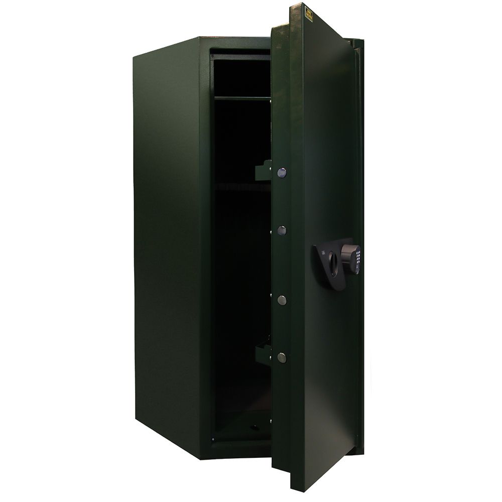 Немецкая фирма Burg-WACHTER вот уже почти сто лет производит высококлассные огнеупорные сейфы. Новинка оснащена электронным кодовым замком с двойным уровнем доступа. Мощная стальная дверь, закрепленная на внутренних петлях, надежно защищает документы и другие ценности. Сейф предназначен для дома, офиса и отелей. • Проведение типовых испытаний и контроль безопасности со стороныECB.S/VdS(органы сертификации систем безопасности) • Защита от пожара и взлома • Двустенчатый корпус • Двустенчатая дверца • Надежная трехсторонняя фиксация посредством мощных 28 мм цилиндрических ригелей • Внутренняя высота до верхней съемной полки 1220 мм • Дополнительные неподвижные ригели с петлевой стороны в качестве подпорки • Соответствует нормам безопасного хранения оружия • Дополнительная защита: Несбрасываемая система аварийной блокировки, встроенная в дверной механизм Модификация E Электронный кодовый замок «SecuTronic», проверен VdS; сертифицирован ECB.S (стандарт EN 1300 класс B). 1 миллион реальных кодовых комбинаций. 3 батареи MicroLR 03 AAA в комплекте. Дверная ручка выдвигается на 50 мм.