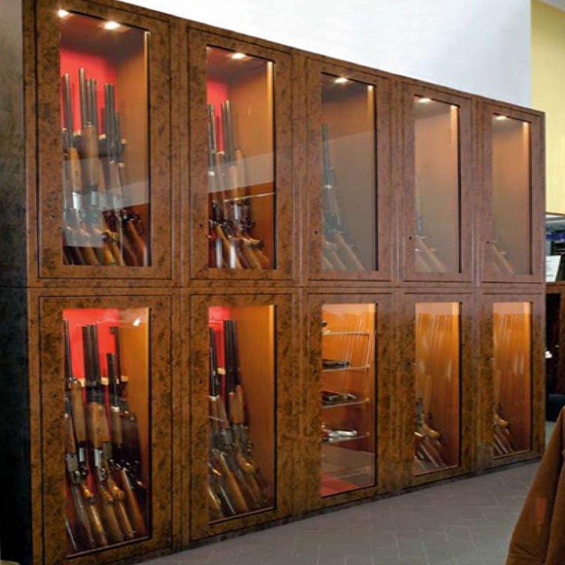 Сейф рассчитан для хранения 20 стволов. Сейф изготовлен в виде витрины, стекло установлено бронированное. Модульная система дает возможность составлять разные комбинации, при различных задачах в дизайне интерьера.