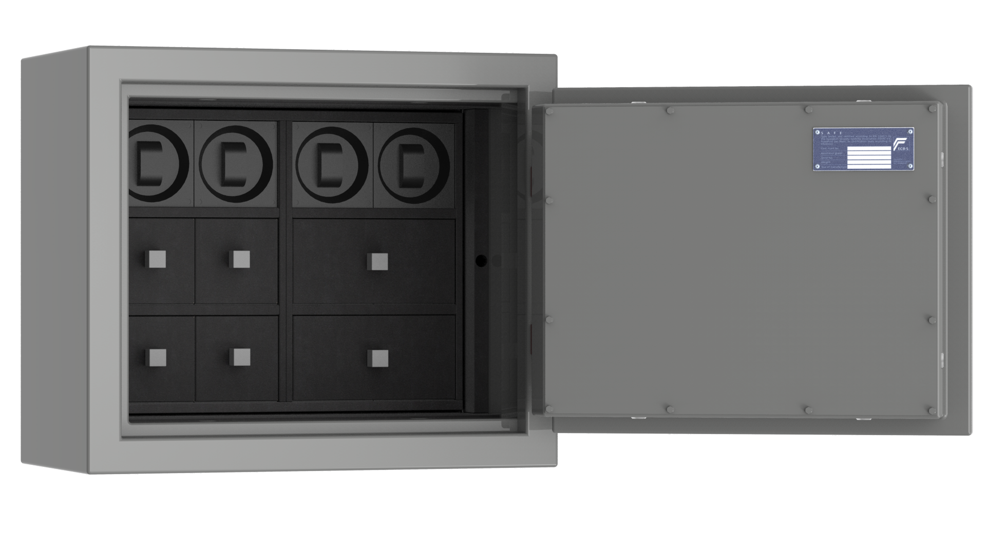 Сейфы могут быть укомплектованы ящиками двух размеров, предназначенными для удобного хранения ювелирных изделий и/или автоподзаводами для часов.