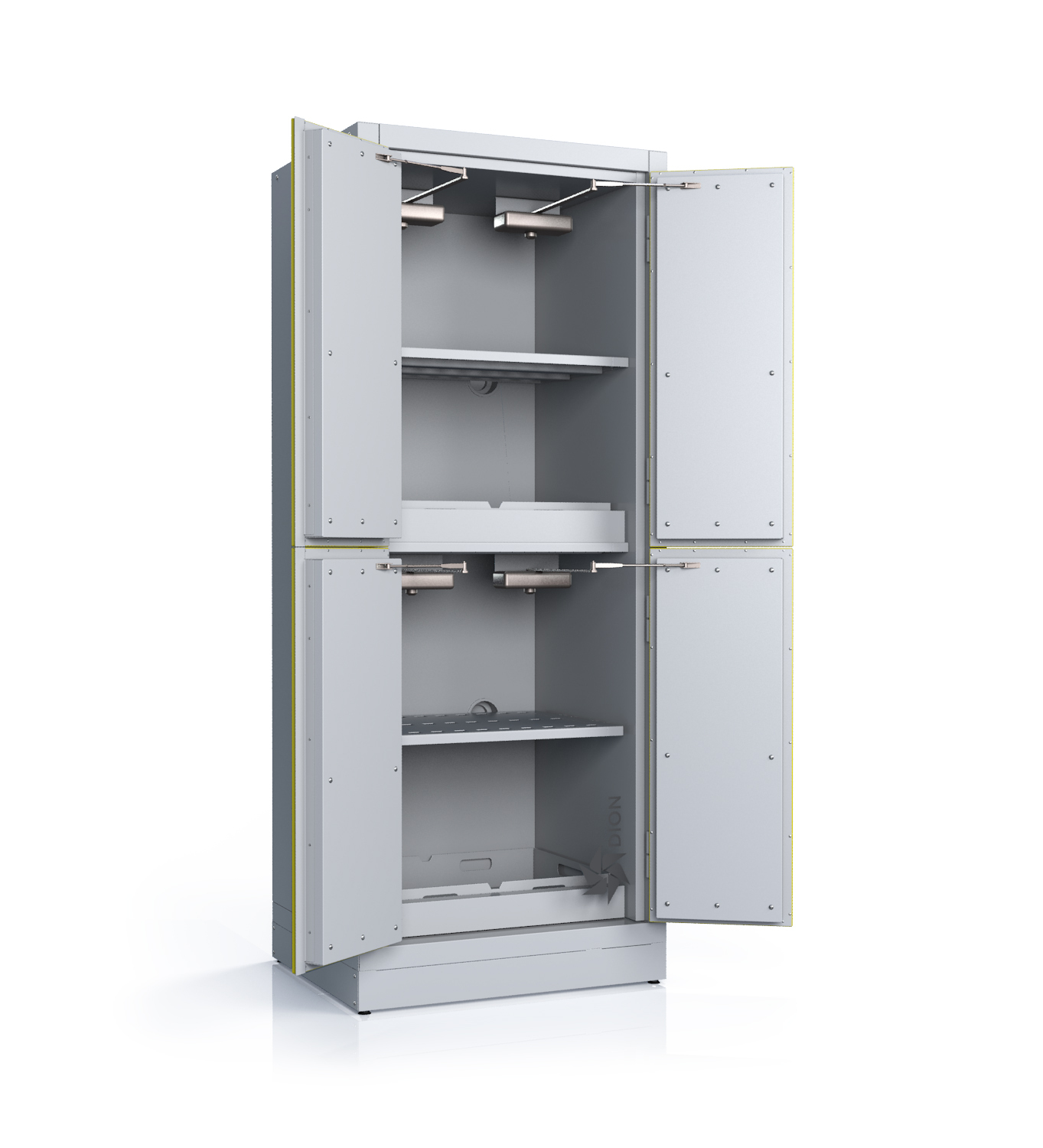 Двери оснащены механизмом автоматического закрывания. Система внутренней вентиляции для паров работает без принудительного нагнетания воздуха и оборудована двумя предохранительными клапанами, которые автоматически закрываются при температуре окружающей среды 70 ± 10°C. Эти клапаны расположены сверху и снизу двери, обеспечивая автоматический выход легковоспламеняющихся веществ наружу. Для подключения к системе вытяжной вентиляции предусмотрен внешний соединительный фланец диаметром 50 мм.
