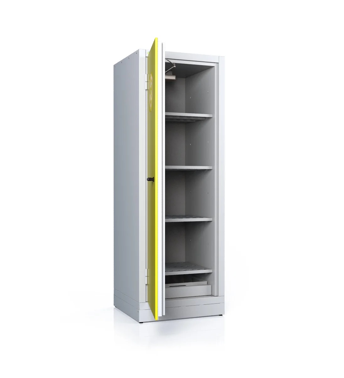 Двери оборудованы механизмом автоматического самозакрытия. Внутренняя вентиляция для паров оснащена двумя предохранительными клапанами, которые автоматически закрываются при температуре 70 ± 10°C. Клапаны расположены сверху и снизу, обеспечивая выход легковоспламеняющихся веществ. Внешний соединительный фланец диаметром 50 мм позволяет подключить шкаф к системе вытяжной вентиляции. В случае пожара система автоматического закрытия удерживает дверь закрытой. Петли двери выполнены из искробезопасных материалов. Замок с цилиндровым механизмом запирается на ключ.