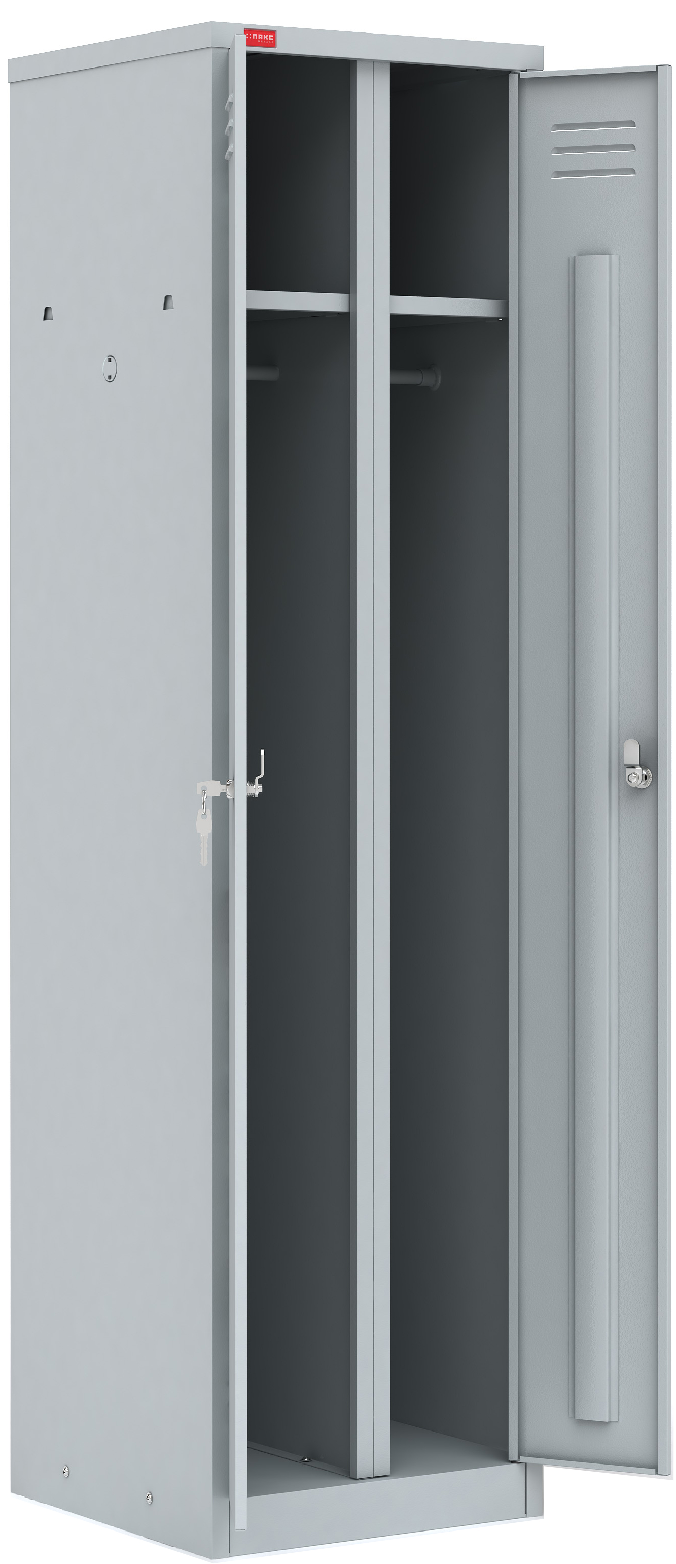 Шкаф металлический разборный двухсекционный, предназначен для хранения сменной одежды. В стандартную комплектацию каждой секции входят съемная полка для головного убора, перекладина для вешалки и крючки для одежды. Шкаф оснащен врезным замком. Поставляется в собранном виде.