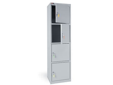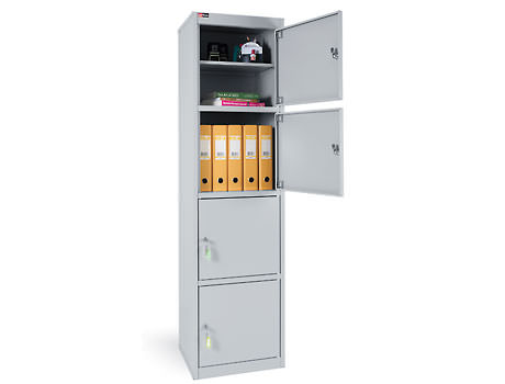 Высокий и узкий металлический шкаф с 4 отделениями без полок предназначен для хранения документов в офисах, архивах и других помещениях. Подходит для папок А4 различного типа. Каждое отделение запирается на замок.