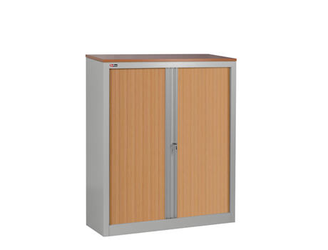 Корпус шкафа и полки окрашены порошковой краской серого цвета RAL 7038. Пластиковые двери-жалюзи шкафа доступны в трёх вариантах: серый, бук и вишня.