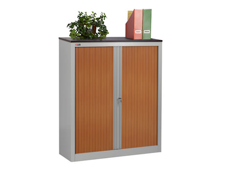 Корпус шкафа и полки окрашены порошковой краской серого цвета RAL 7038. Пластиковые двери-жалюзи шкафа доступны в трёх вариантах: серый, бук и вишня.