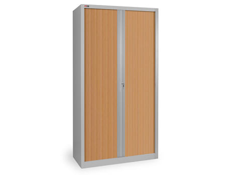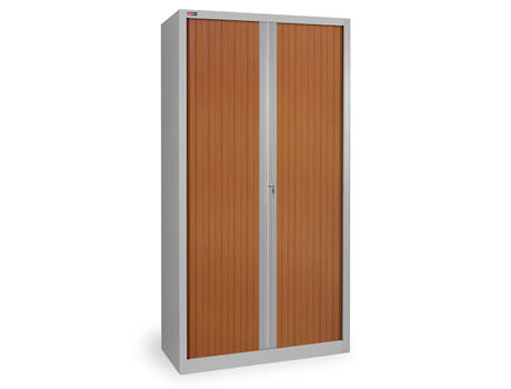 Двери выполнены в виде пластиковых панелей-жалюзи, которые при открытии складываются в боковые стенки шкафа. Это позволяет экономить пространство, так как не требуется дополнительное место для открывания традиционных распашных дверей. Полки в шкафу универсальны и позволяют хранить документы в папках различных типов, включая "Корона" и подвесные папки "Pendaflex". Регулировка полок по высоте с шагом в 25 мм дает возможность оптимизировать пространство под различные форматы документов и папок.