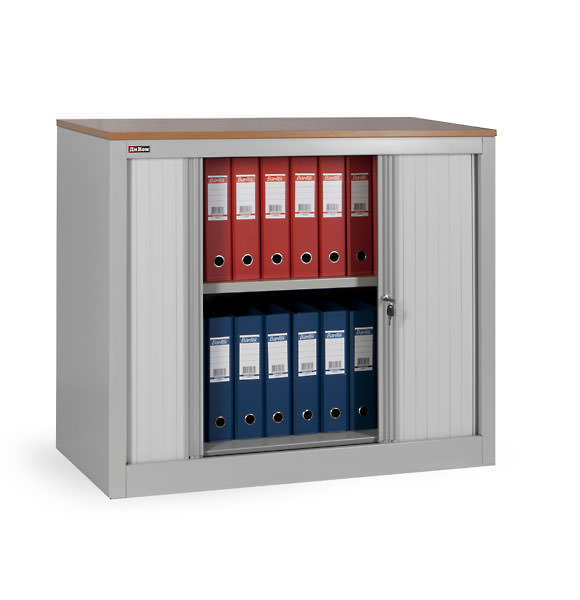 Оснащён пластиковыми дверьми-жалюзи, которые складываются в стороны, экономя тем самым пространство. Имеются универсальные полки, высота которых регулируется с шагом в 25 мм. Подходят для хранения документов в папках "Корона" и в подвесных папках "Pendaflex". Возможна установка дополнительных полок. В комплект входит столешница из ламинированного ДСП, доступная в цветах "светлый бук" или "шоколадный дуб".