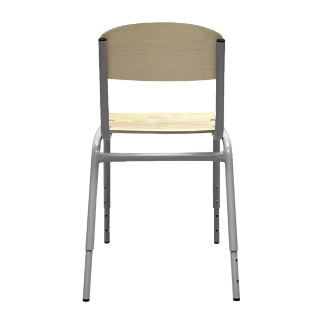 Регулируемый по высоте стул самых маленьких ростовых групп: 0-1 и 1-3. Каркас стула изготовлен из стальной трубы круглого сечения, покрашен полименой порошковой краской. Спинка и сиденье стула выполнены из гнуто-клееной фанеры, покрыты бесцветным лаком.