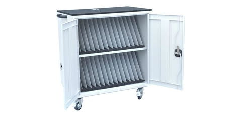 - Тележка используется для хранения и зарядки 30 ноутбуков.
