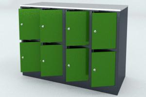 Сумочные шкафы выполнены из нержавеющей стали. Они оснащены регулируемыми по высоте опорами и покрыты порошковой краской. Большинство моделей имеют серый цвет. Но по желанию заказчика мы можем окрасить шкаф в другие цвета.